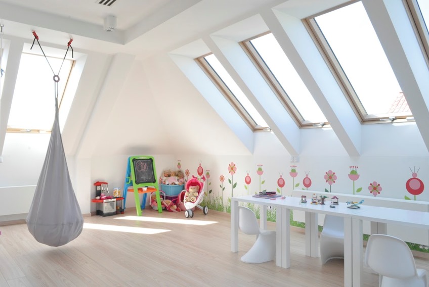 Doordat het speelgoed en de meubels in een kinderkamer vaak al kleurrijk genoeg zijn, is het fijn om de basis een beetje rustig te houden met een lichte kleur verf. Door de lichte kleur en het binnenvallend daglicht lijkt de kinderkamer optisch groter. Gebruik voor de inrichting van de kinderkamer ‘slimme meubels’. Denk hierbij bijvoorbeeld aan een bankje die als extra slaapplek gebruikt kan worden, een stoeltje of krukje als nachtkastje of een matrasje op de speelgoedkist, zodat deze ook als bank gebruikt kan worden. Laat meer natuurlijk licht binnenvallen door een dakraam of lichtkoepel te plaatsen. Daglicht zorgt namelijk voor extra energie en het stimuleert ook de creativiteit van een kind.